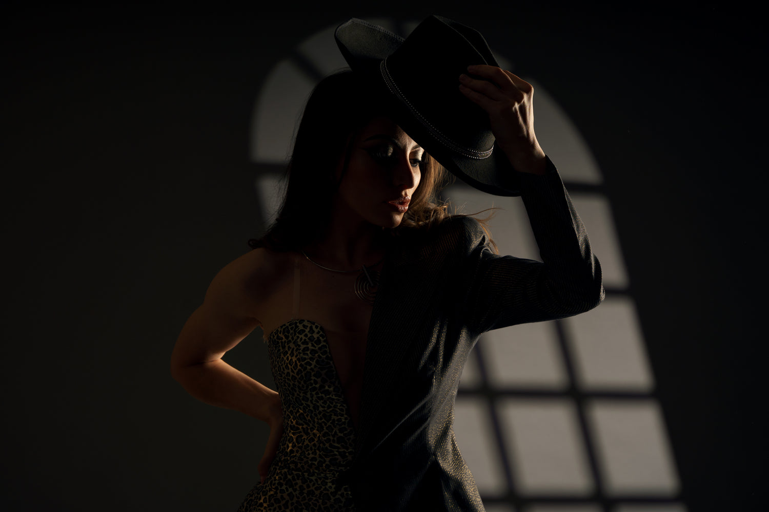 The juxtaposition of the sleek, pinstripe pattern of the blazer against the wild, untamed print of the corset and shorts creates a dynamic contrast, symbolizing the multifaceted nature of the modern woman.