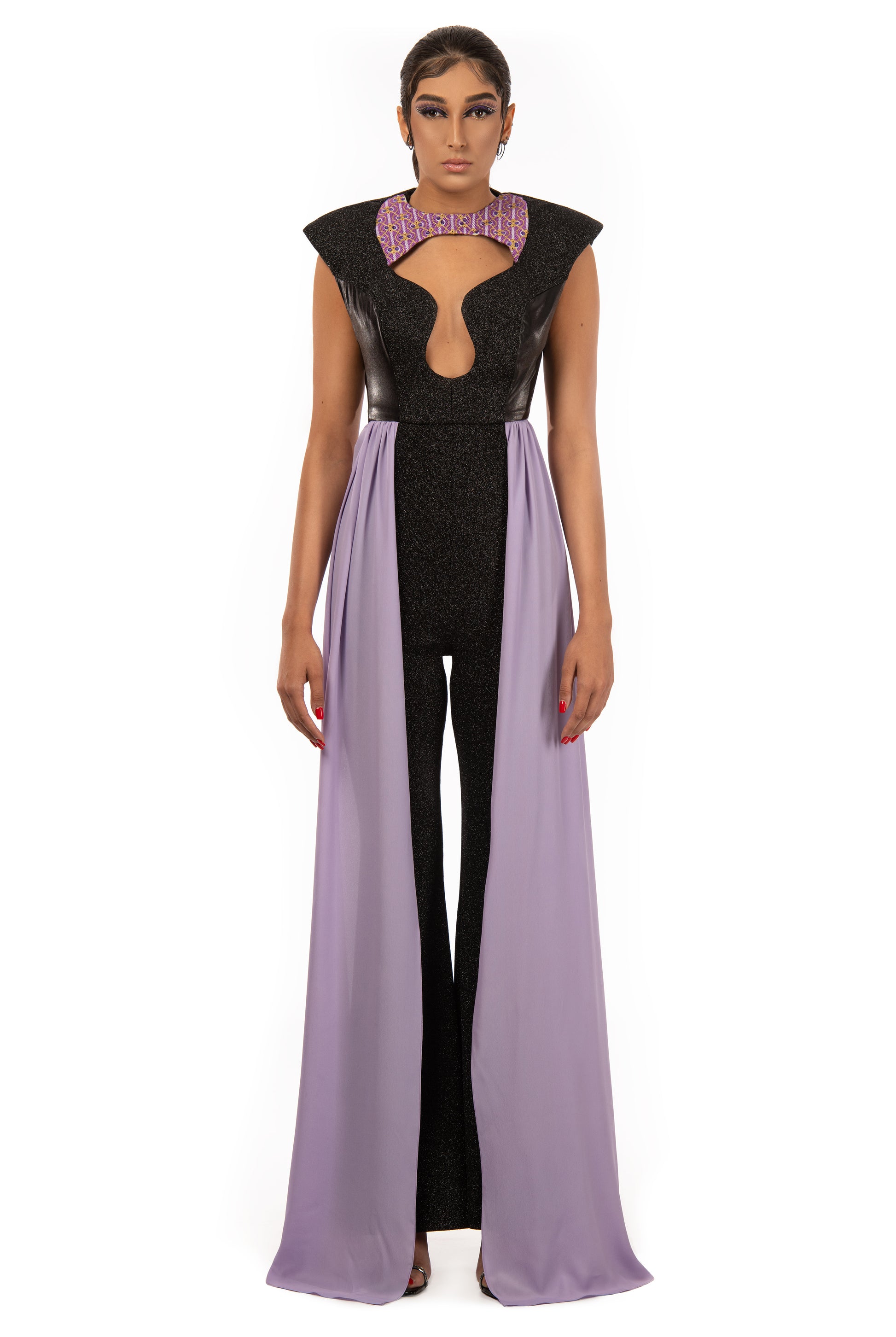 Tight, highwaisted jumpsuit with long flared pants and a distinctive cut in the bodice. Low cut bodice, has the intention to spice up the romantic look and give it just a hint of sexiness. Juxtaposing the use of eco leather, a sparkling lurex and silk fabric to achieve the untamed, but delicate look.