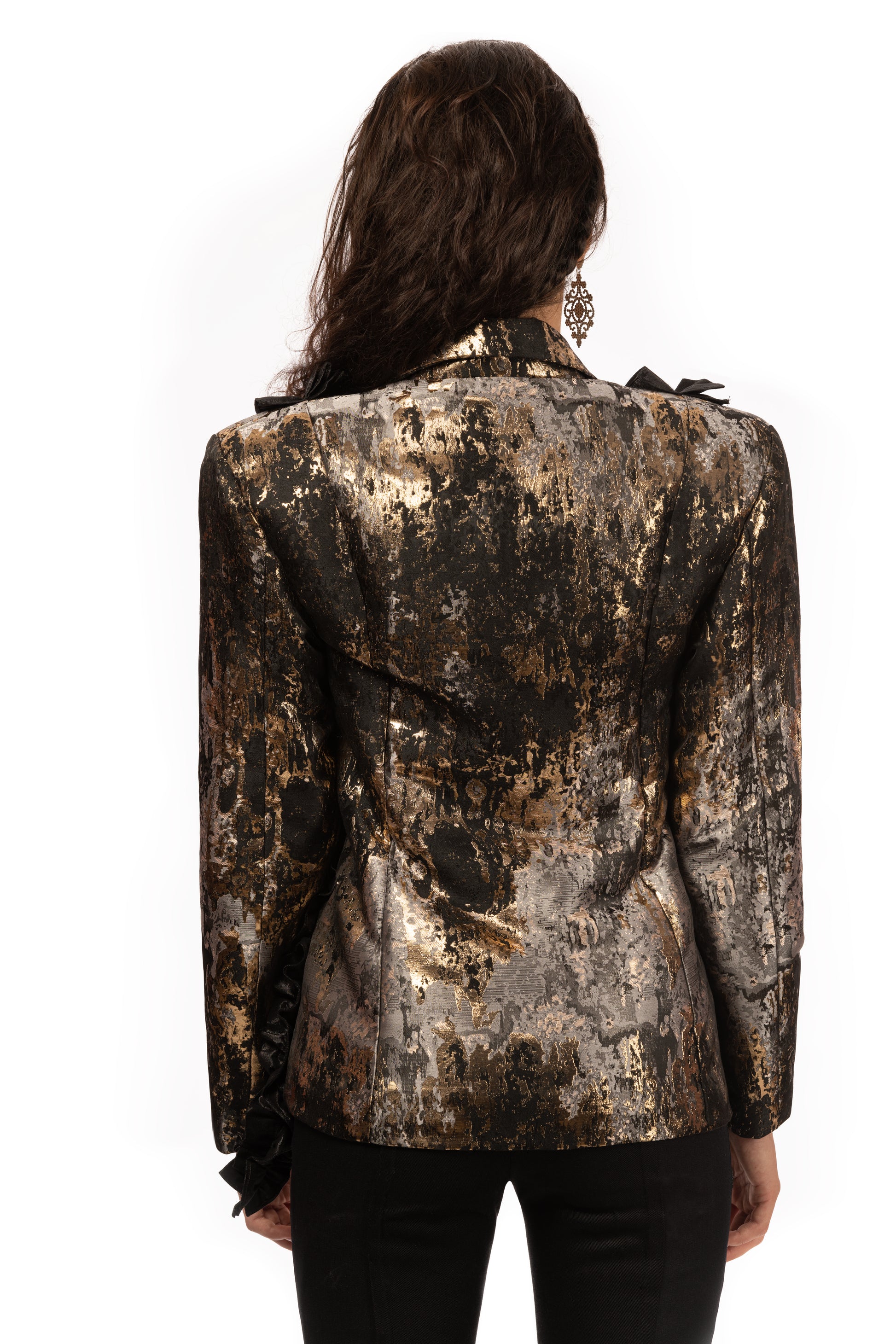 The fabric used for the tucked ruffles is shiny, which reflects nicely when hit by the light and fits to the extravagant brocade used for the blazer.