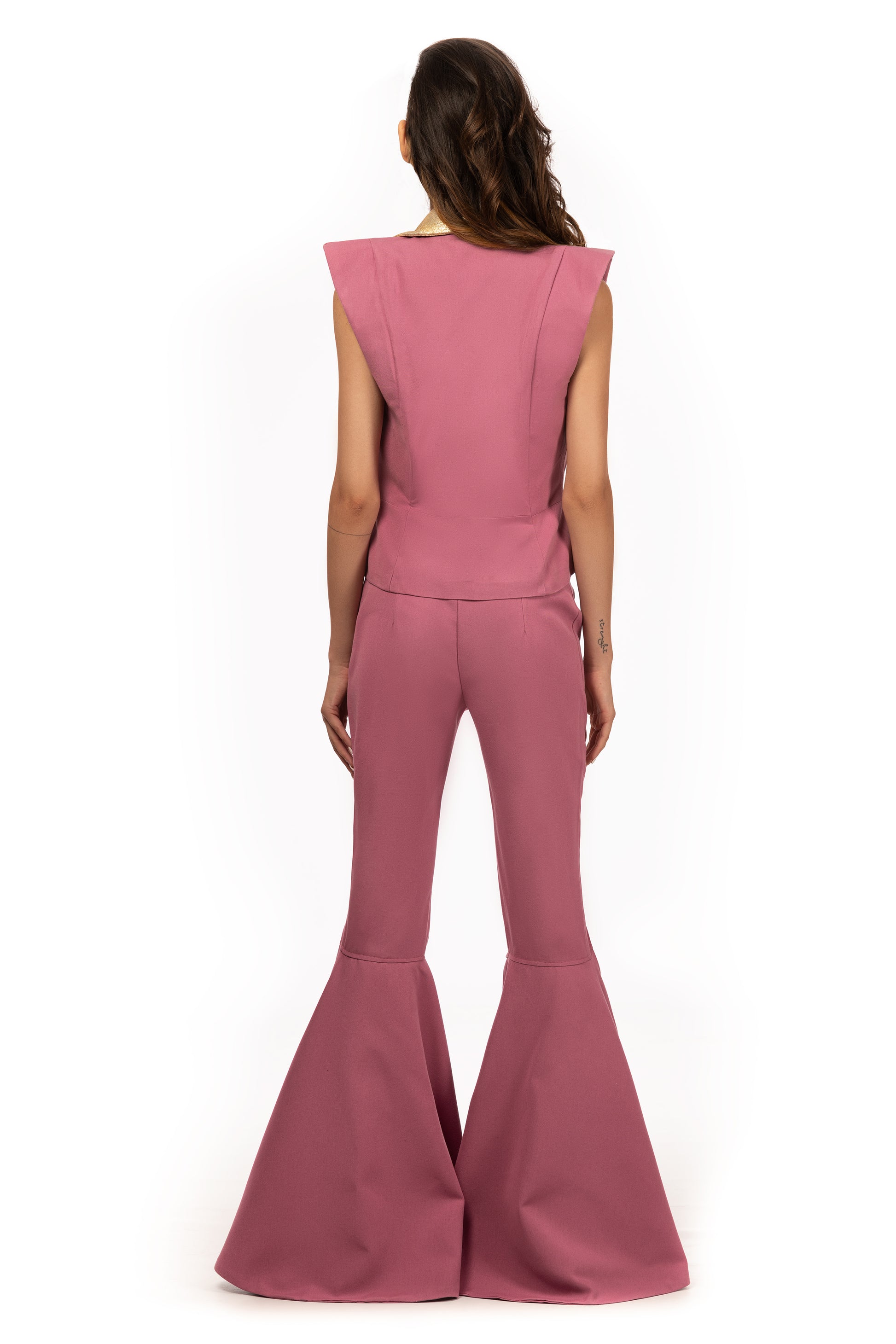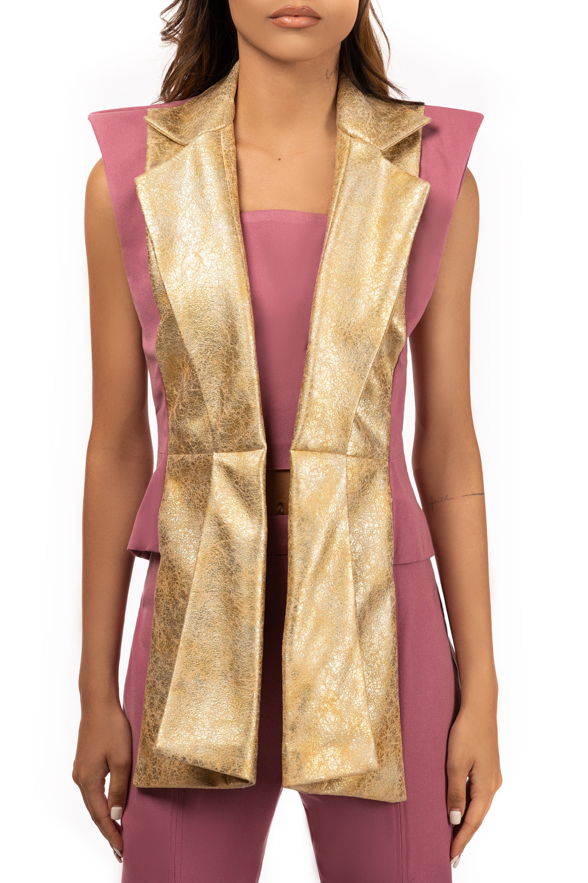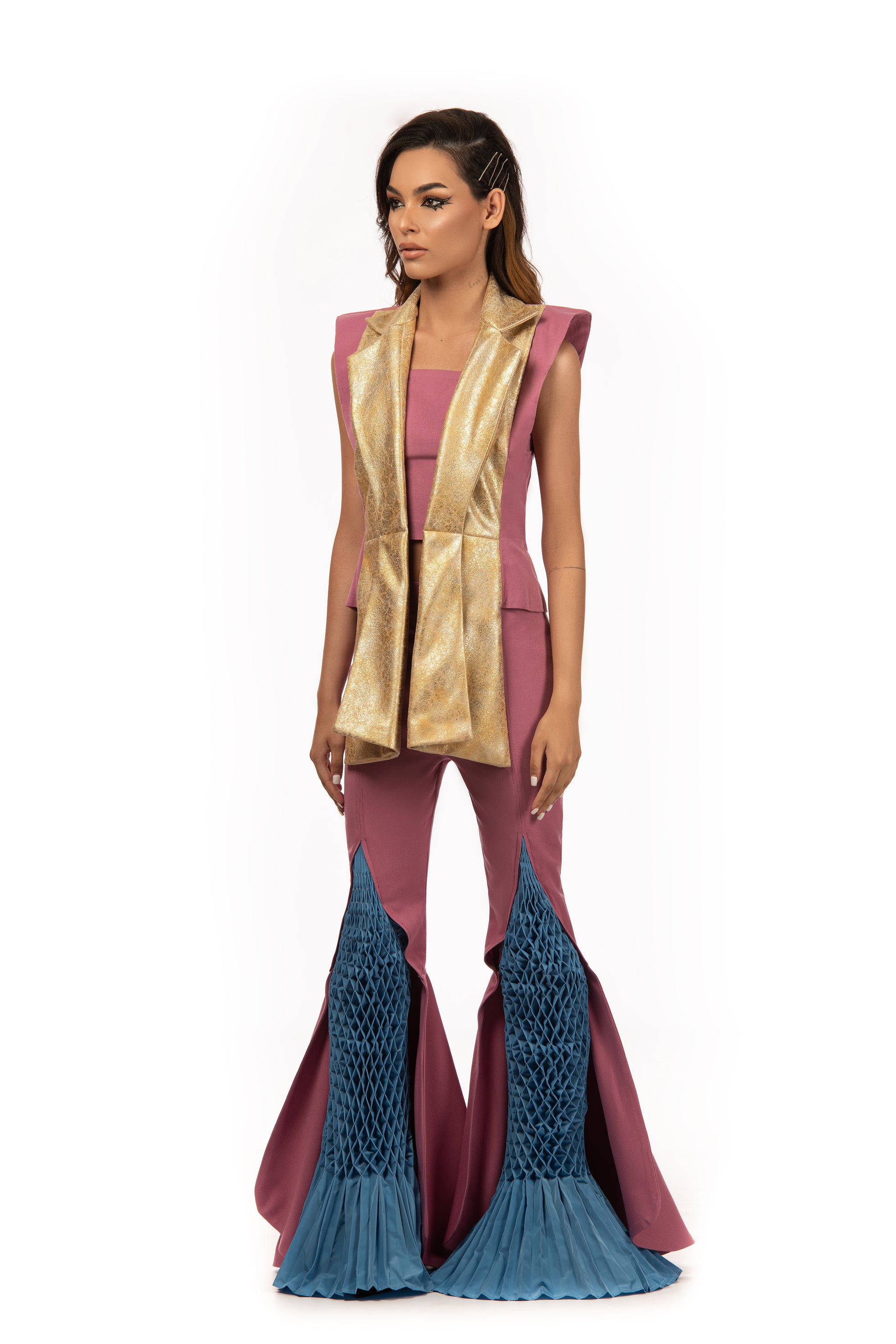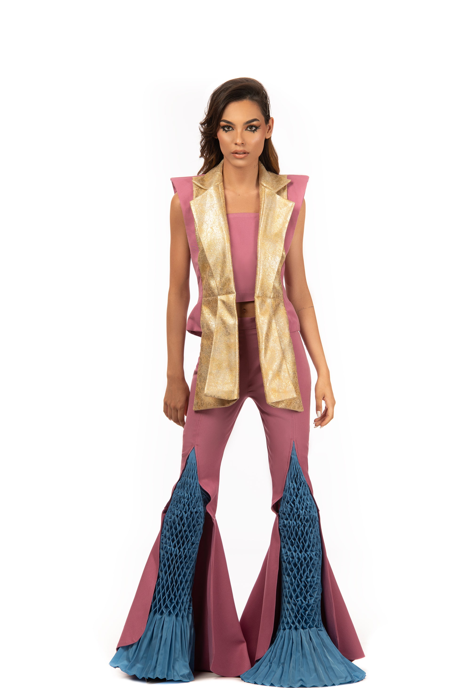 Structured blazer with oversized and pointy shoulders, in order to vest a vigorous feeling. The blazer is sleeveless and is big on the waist, in order to emphasize the silhouette of the body. The lapel is fully flipped towards the outside of the blazer and fixed on the waistline, to bring movement into the blazer.