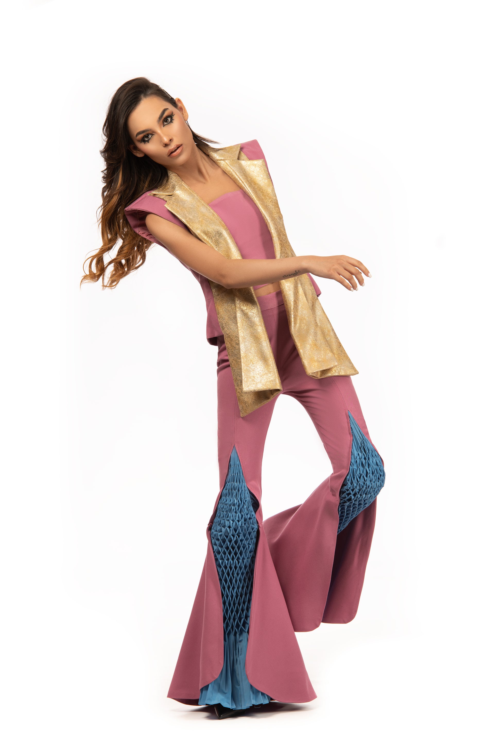 High waisted pants are tight at the top and extremely flared at the bottom. There is an opening on the center front of the pant, starting from above the knee. Underneath the flared pants, there is another layer of tights with a honeycomb smocking attached on the front, to enhance the fanciful persona. The flared honeycomb smocking moves separately to the rest of the ant, in order to create a playful diversion.